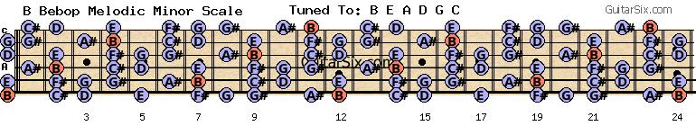 b-e-a-d-g-c b bebop melodic minor scale for guitar