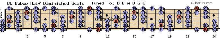 b-e-a-d-g-c bb bebop half diminished scale for guitar