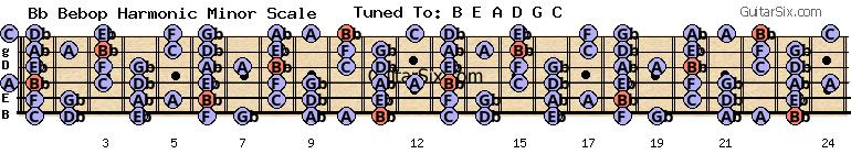 b-e-a-d-g-c bb bebop harmonic minor scale for guitar