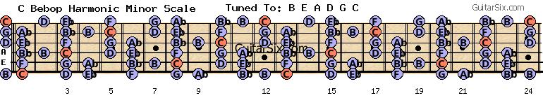 b-e-a-d-g-c c bebop harmonic minor scale for guitar