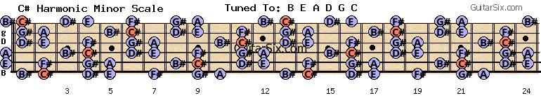 b-e-a-d-g-c c# harmonic minor scale for guitar