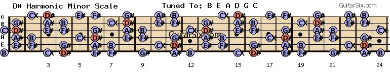 b-e-a-d-g-c d# harmonic minor scale for guitar