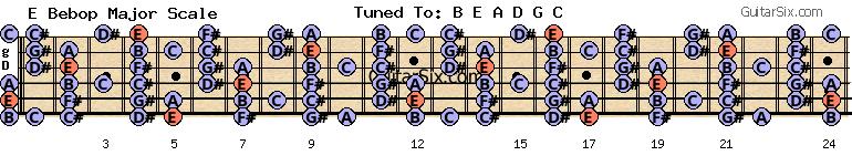 b-e-a-d-g-c e bebop major scale for guitar
