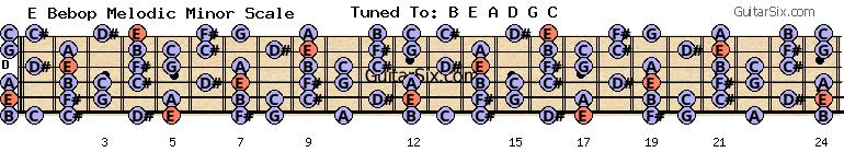 b-e-a-d-g-c e bebop melodic minor scale for guitar