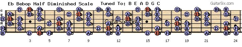 b-e-a-d-g-c eb bebop half diminished scale for guitar