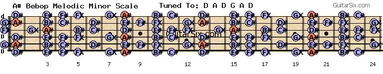 d-a-d-g-a-d a# bebop melodic minor scale for guitar
