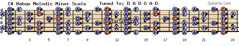 d-a-d-g-a-d c# bebop melodic minor scale for guitar