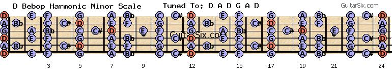 d-a-d-g-a-d d bebop harmonic minor scale for guitar