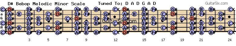 d-a-d-g-a-d d# bebop melodic minor scale for guitar
