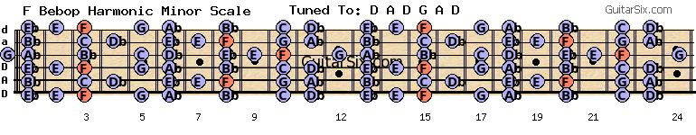 d-a-d-g-a-d f bebop harmonic minor scale for guitar