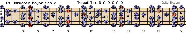 d-a-d-g-a-d f# harmonic major scale for guitar
