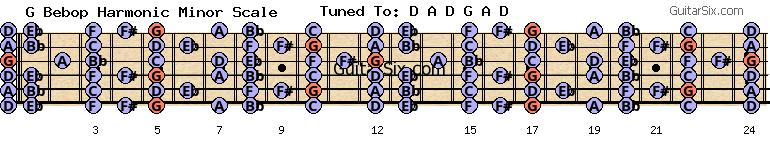d-a-d-g-a-d g bebop harmonic minor scale for guitar