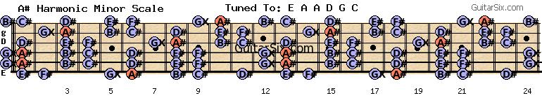e-a-a-d-g-c a# harmonic minor scale for guitar