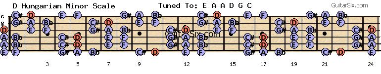 e-a-a-d-g-c d hungarian minor scale for guitar