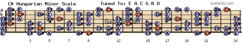 e-a-c-g-b-d c# hungarian minor scale for guitar