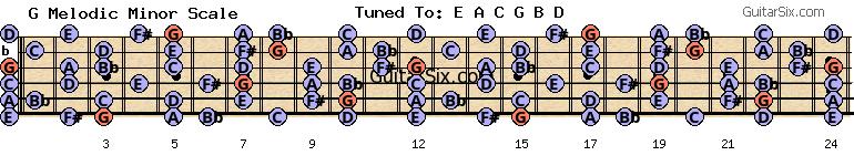 e-a-c-g-b-d g melodic minor scale for guitar