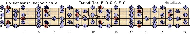 e-a-g-c-e-a bb harmonic major scale for guitar