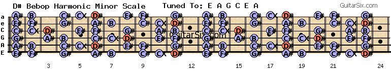 e-a-g-c-e-a d# bebop harmonic minor scale for guitar