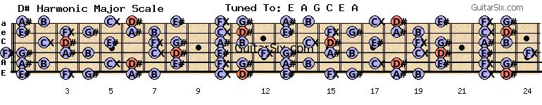 e-a-g-c-e-a d# harmonic major scale for guitar