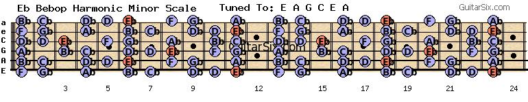 e-a-g-c-e-a eb bebop harmonic minor scale for guitar