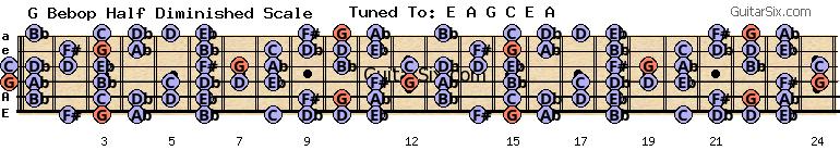 e-a-g-c-e-a g bebop half diminished scale for guitar