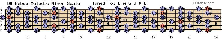 e-a-g-d-a-e d# bebop melodic minor scale for guitar