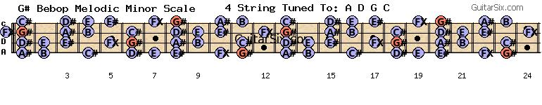 b-e-a-d-g-c g# bebop melodic minor scale for guitar