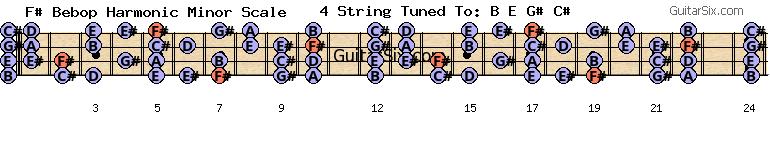 b-f#-b-e-g#-c# f# bebop harmonic minor scale for guitar