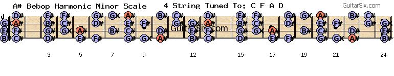 c-g-c-f-a-d a# bebop harmonic minor scale for guitar