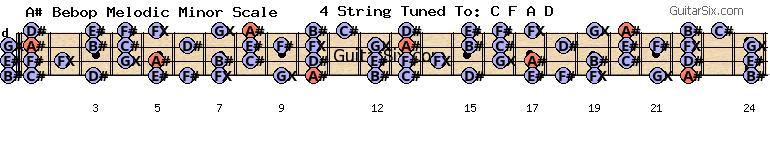 c-g-c-f-a-d a# bebop melodic minor scale for guitar