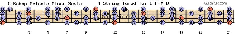 c-g-c-f-a-d c bebop melodic minor scale for guitar
