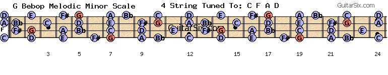 c-g-c-f-a-d g bebop melodic minor scale for guitar
