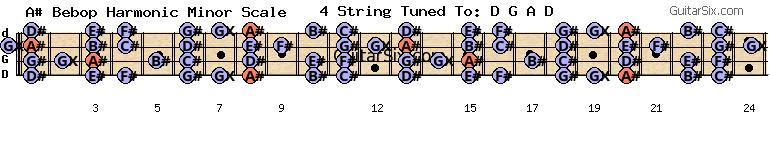 d-a-d-g-a-d a# bebop harmonic minor scale for guitar