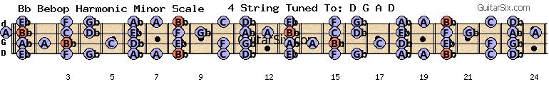 d-a-d-g-a-d bb bebop harmonic minor scale for guitar