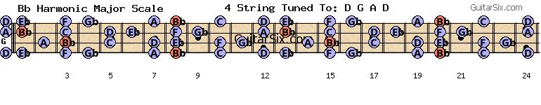 d-a-d-g-a-d bb harmonic major scale for guitar