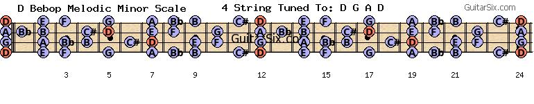 d-a-d-g-a-d d bebop melodic minor scale for guitar