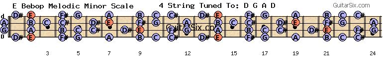 d-a-d-g-a-d e bebop melodic minor scale for guitar