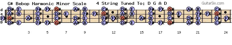 d-a-d-g-a-d g# bebop harmonic minor scale for guitar