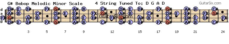 d-a-d-g-a-d g# bebop melodic minor scale for guitar