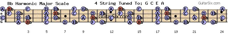 e-a-g-c-e-a bb harmonic major scale for guitar