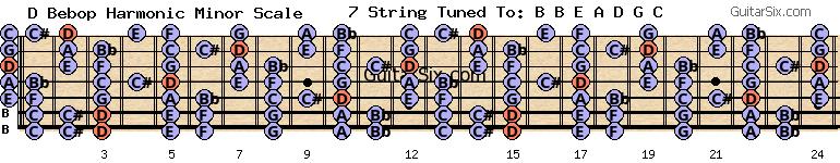 b-e-a-d-g-c d bebop harmonic minor scale for guitar