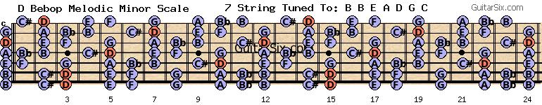 b-e-a-d-g-c d bebop melodic minor scale for guitar