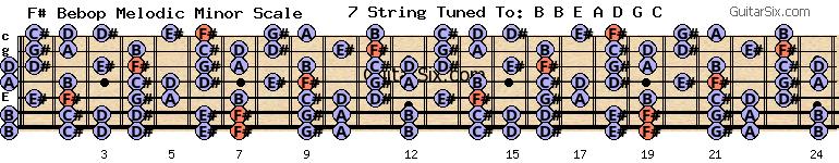 b-e-a-d-g-c f# bebop melodic minor scale for guitar