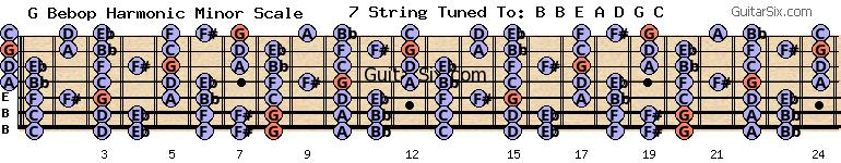 b-e-a-d-g-c g bebop harmonic minor scale for guitar