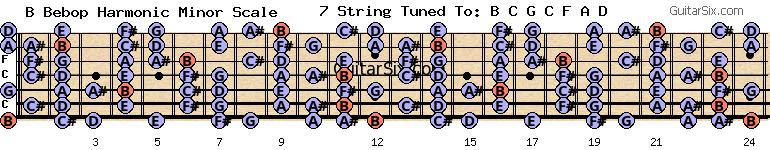 c-g-c-f-a-d b bebop harmonic minor scale for guitar