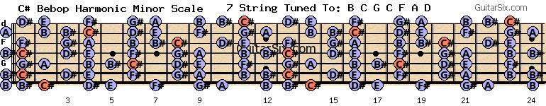 c-g-c-f-a-d c# bebop harmonic minor scale for guitar