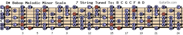 c-g-c-f-a-d d# bebop melodic minor scale for guitar
