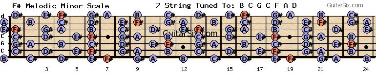 c-g-c-f-a-d f# melodic minor scale for guitar
