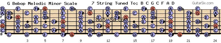 c-g-c-f-a-d g bebop melodic minor scale for guitar