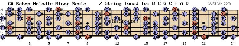 c-g-c-f-a-d g# bebop melodic minor scale for guitar